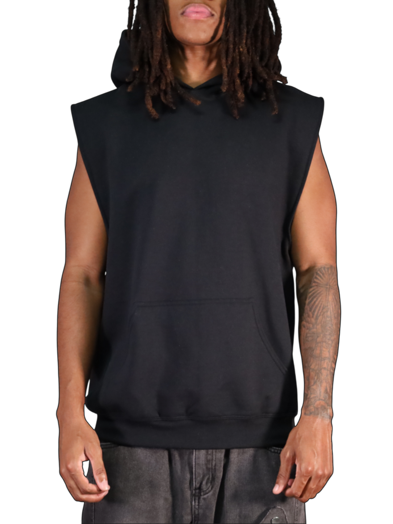 A BOLD TANK-TOP CUT HOODIE DESIGNED TO SHOWCASE THE SHOULDERS, FEATURING AN OVERSIZED HOOD WITH FOUR HAND-SEWN SPIKES FILLED WITH FIBER FOR A SCULPTED, BEAST LIKE. THE DESIGN CREATES A WILD ANIMALS OPEN MOUTH, WHILE THE SIGNATURE TAG SITS AT THE CENTER OF THE HOOD SYMBOLIZING UNCONDITIONAL LOVE WITHIN EVEN THE FIERCEST FORM.